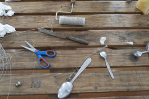 construídos a partir de material vulgar, por um processo de reciclagem e reconversão, que valoriza a fonética depreciável ou perdida do material, sua natureza, memória e nudez. Ocorre por exploração plástica, pela inclusão de materiais, estritamente para a corporização do objecto visual e sonoro, com minúcia e particularidade, sem cosmética, com narrativa na construção e uma constante consideração do comportamento ficcional. Uma quimera, um amoldar heterogéneo para se revelar numa figura homogénea.
